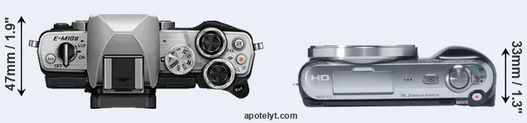 An illustration of the physical size and weight of the Olympus E-M10 II and the Sony NEX-C3 is provided in the side-by-side display below. The two cameras are presented according to their relative size. Three consecutive perspectives from the front, the top, and the back are available. All width, height and depth dimensions are rounded to the nearest millimeter.