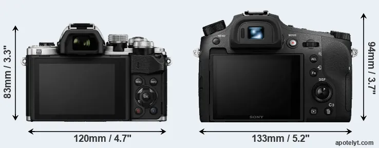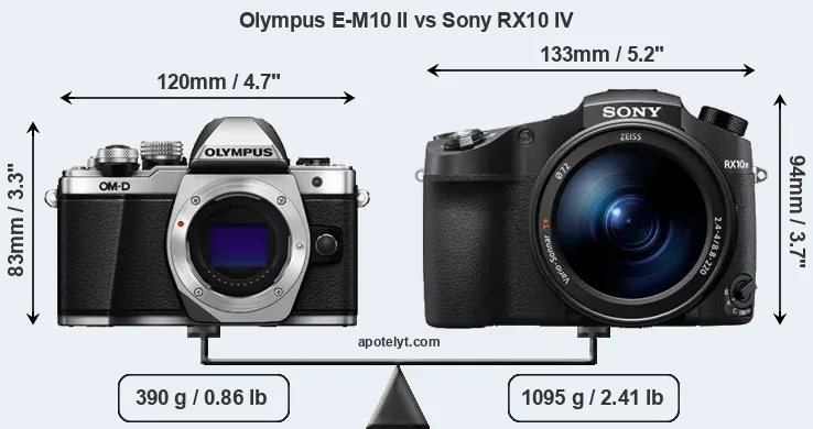 If the front view area (width x height) of the cameras is taken as an aggregate measure of their size, the Sony RX10 IV is notably larger (26 percent) than the Olympus E-M10 II. It is noteworthy in this context that the RX10 IV is splash and dust-proof, while the E-M10 II does not feature any corresponding weather-sealing.