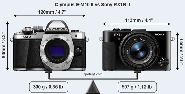 The side-by-side display below illustrates the physical size and weight of the Olympus E-M10 II and the Sony RX1R II. The two cameras are presented according to their relative size. Three consecutive perspectives from the front, the top, and the back are available. All width, height and depth measures are rounded to the nearest millimeter.