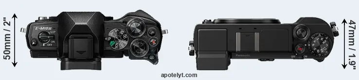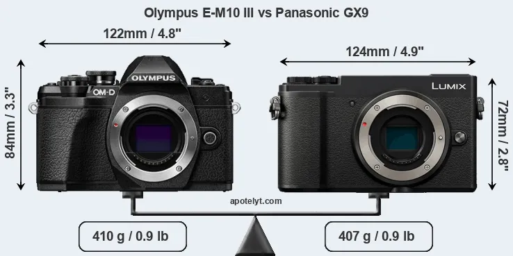 The side-by-side display below illustrates the physical size and weight of the Olympus E-M10 III and the Panasonic GX9. The two cameras are presented according to their relative size. Three consecutive perspectives from the front, the top, and the back are available. All width, height and depth measures are rounded to the nearest millimeter.