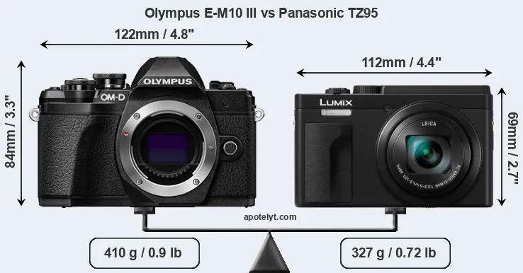 The physical size and weight of the Olympus E-M10 III and the Panasonic TZ95 are illustrated in the side-by-side display below. The two cameras are presented according to their relative size. Three successive views from the front, the top, and the rear are shown. All width, height and depth dimensions are rounded to the nearest millimeter.