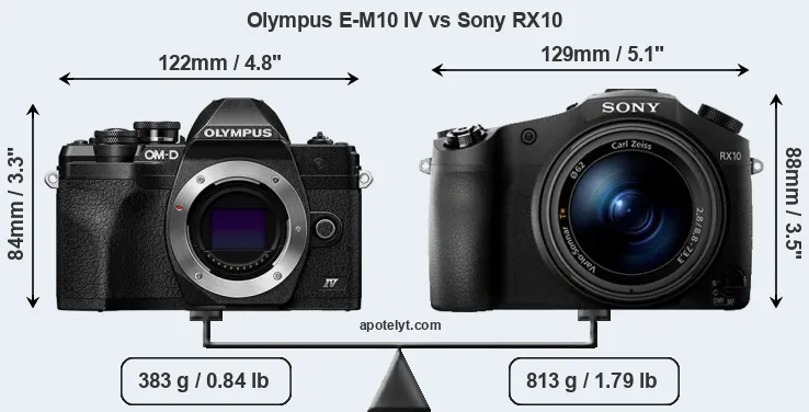 If the front view area (width x height) of the cameras is taken as an aggregate measure of their size, the Sony RX10 is notably larger (11 percent) than the Olympus E-M10 IV. It is noteworthy in this context that the RX10 is splash and dust-proof, while the E-M10 IV does not feature any corresponding weather-sealing.