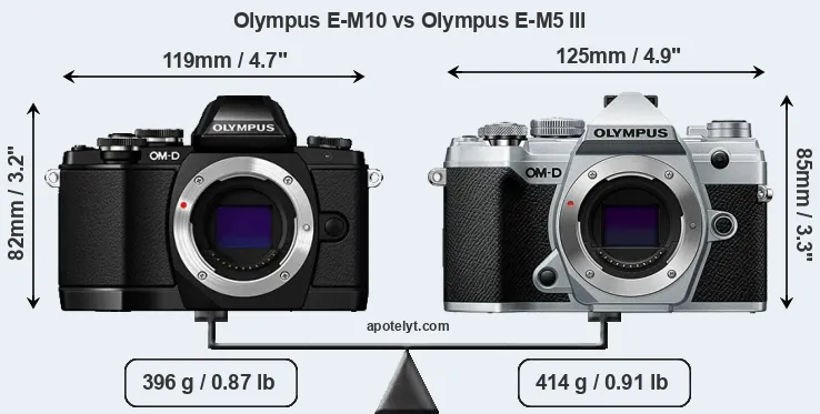 An illustration of the physical size and weight of the Olympus E-M10 and the Olympus E-M5 III is provided in the side-by-side display below. The two cameras are presented according to their relative size. Three consecutive perspectives from the front, the top, and the back are available. All width, height and depth measures are rounded to the nearest millimeter.