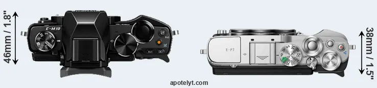An illustration of the physical size and weight of the Olympus E-M10 and the Olympus E-P7 is provided in the side-by-side display below. The two cameras are presented according to their relative size. Three consecutive perspectives from the front, the top, and the back are available. All size dimensions are rounded to the nearest millimeter.