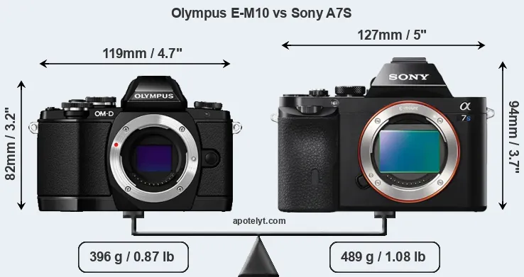 If the front view area (width x height) of the cameras is taken as an aggregate measure of their size, the Sony A7S is notably larger (22 percent) than the Olympus E-M10. Moreover, the A7S is markedly heavier (23 percent) than the E-M10. It is noteworthy in this context that the A7S is splash and dust-proof, while the E-M10 does not feature any corresponding weather-sealing.