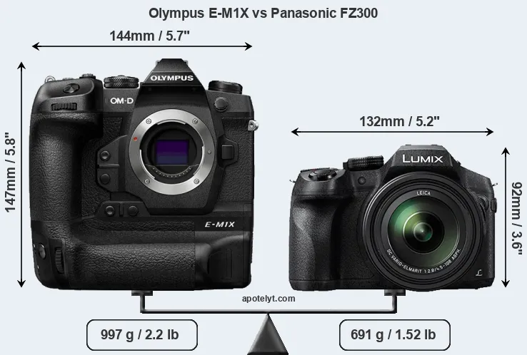 The side-by-side display below illustrates the physical size and weight of the Olympus E-M1X and the Panasonic FZ300. The two cameras are presented according to their relative size. Three consecutive perspectives from the front, the top, and the back are available. All width, height and depth measures are rounded to the nearest millimeter.