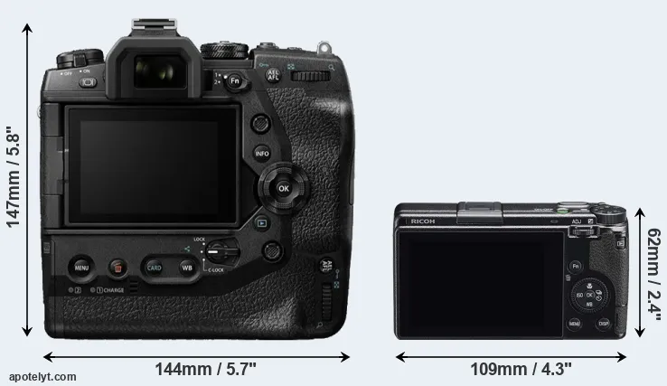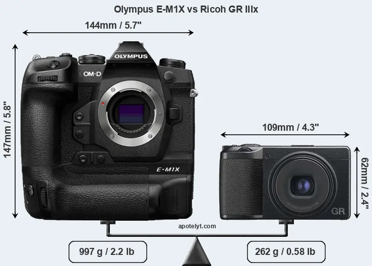 An illustration of the physical size and weight of the Olympus E-M1X and the Ricoh GR IIIx is provided in the side-by-side display below. The two cameras are presented according to their relative size. Three consecutive views from the front, the top, and the rear side are shown. All width, height and depth dimensions are rounded to the nearest millimeter.
