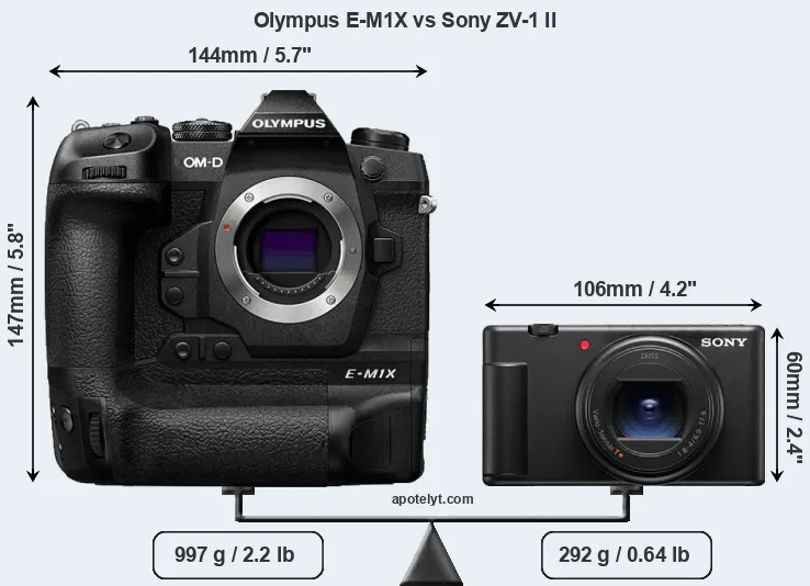 The above size and weight comparisons are to some extent incomplete and possibly misleading, as the ZV-1 II has a lens built in, whereas the E-M1X is an interchangeable lens camera that requires a separate lens. Attaching the latter will add extra weight and bulk to the setup. You can compare the optics available for the E-M1X and their specifications in the Micro Four Thirds Lens Catalog.