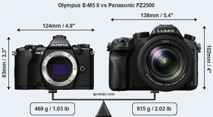 The physical size and weight of the Olympus E-M5 II and the Panasonic FZ2500 are illustrated in the side-by-side display below. The two cameras are presented according to their relative size. Three consecutive views from the front, the top, and the rear side are shown. All width, height and depth dimensions are rounded to the nearest millimeter.