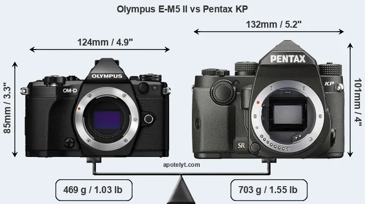 The side-by-side display below illustrates the physical size and weight of the Olympus E-M5 II and the Pentax KP. The two cameras are presented according to their relative size. Three successive views from the front, the top, and the rear are shown. All width, height and depth measures are rounded to the nearest millimeter.