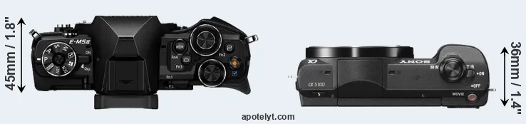 The side-by-side display below illustrates the physical size and weight of the Olympus E-M5 II and the Sony A5100. The two cameras are presented according to their relative size. Three successive views from the front, the top, and the rear are shown. All size dimensions are rounded to the nearest millimeter.