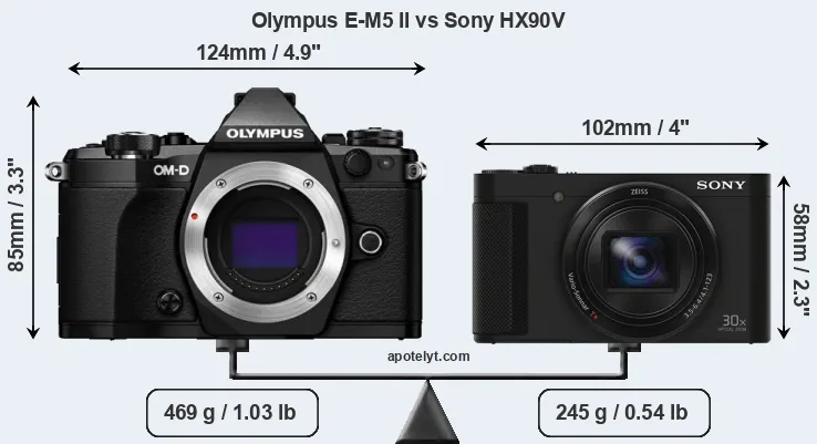 An illustration of the physical size and weight of the Olympus E-M5 II and the Sony HX90V is provided in the side-by-side display below. The two cameras are presented according to their relative size. Three successive views from the front, the top, and the rear are shown. All width, height and depth measures are rounded to the nearest millimeter.