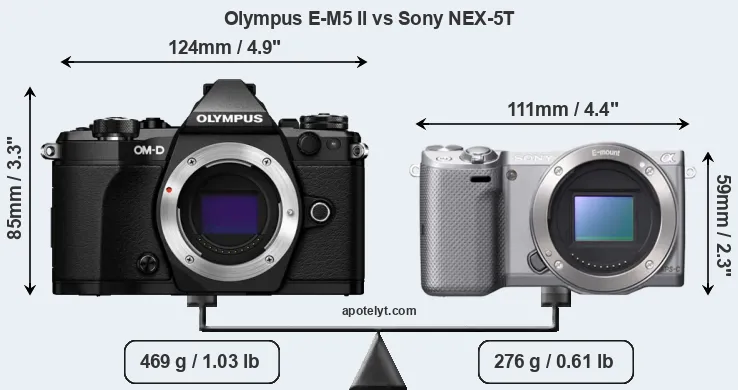 The side-by-side display below illustrates the physical size and weight of the Olympus E-M5 II and the Sony NEX-5T. The two cameras are presented according to their relative size. Three consecutive perspectives from the front, the top, and the back are available. All width, height and depth dimensions are rounded to the nearest millimeter.