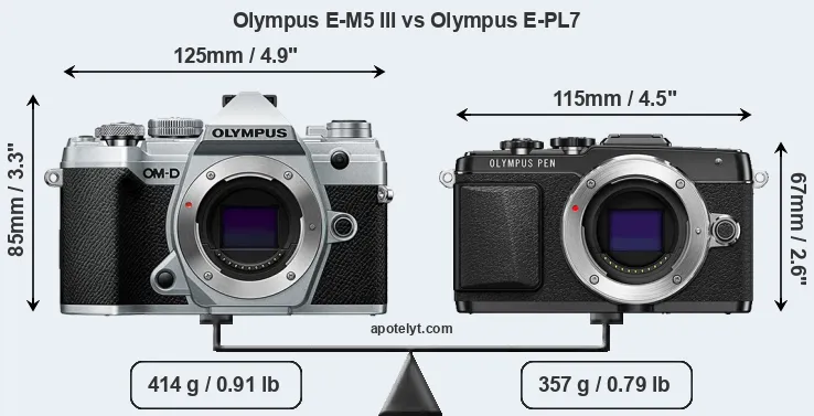 An illustration of the physical size and weight of the Olympus E-M5 III and the Olympus E-PL7 is provided in the side-by-side display below. The two cameras are presented according to their relative size. Three consecutive perspectives from the front, the top, and the back are available. All width, height and depth dimensions are rounded to the nearest millimeter.