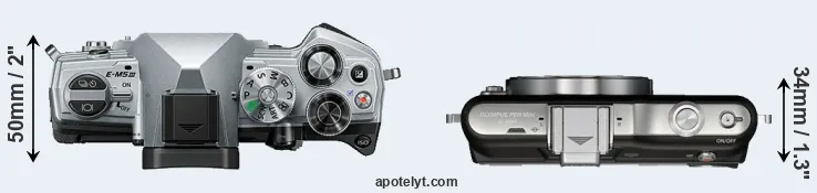 The physical size and weight of the Olympus E-M5 III and the Olympus E-PM1 are illustrated in the side-by-side display below. The two cameras are presented according to their relative size. Three consecutive perspectives from the front, the top, and the back are available. All width, height and depth dimensions are rounded to the nearest millimeter.