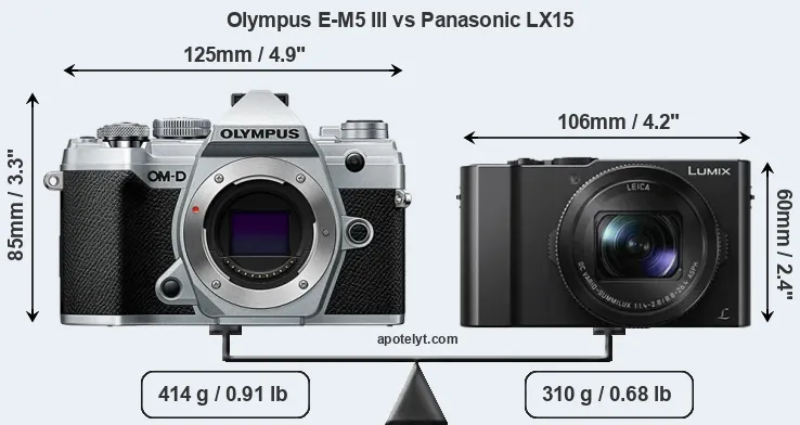 The above size and weight comparisons are to some extent incomplete and possibly misleading, as the LX15 has a lens built in, whereas the E-M5 III is an interchangeable lens camera that requires a separate lens. Attaching the latter will add extra weight and bulk to the setup. You can compare the optics available for the E-M5 III and their specifications in the Micro Four Thirds Lens Catalog.