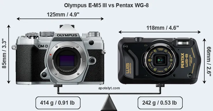 The side-by-side display below illustrates the physical size and weight of the Olympus E-M5 III and the Pentax WG-8. The two cameras are presented according to their relative size. Three successive views from the front, the top, and the rear are shown. All size dimensions are rounded to the nearest millimeter.