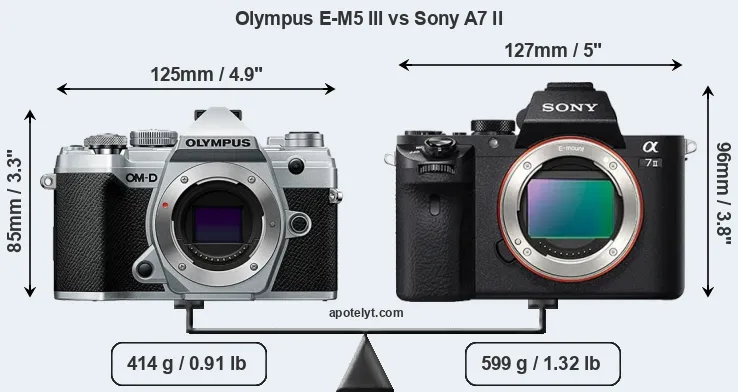 An illustration of the physical size and weight of the Olympus E-M5 III and the Sony A7 II is provided in the side-by-side display below. The two cameras are presented according to their relative size. Three consecutive views from the front, the top, and the rear side are shown. All width, height and depth dimensions are rounded to the nearest millimeter.