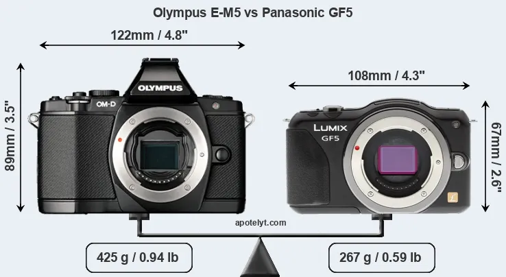 The physical size and weight of the Olympus E-M5 and the Panasonic GF5 are illustrated in the side-by-side display below. The two cameras are presented according to their relative size. Three consecutive perspectives from the front, the top, and the back are available. All width, height and depth dimensions are rounded to the nearest millimeter.