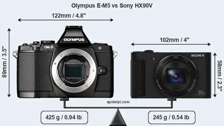 An illustration of the physical size and weight of the Olympus E-M5 and the Sony HX90V is provided in the side-by-side display below. The two cameras are presented according to their relative size. Three consecutive perspectives from the front, the top, and the back are available. All size dimensions are rounded to the nearest millimeter.