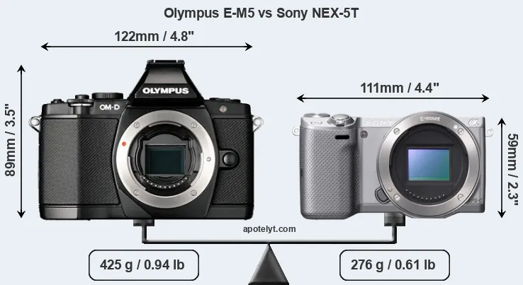 The side-by-side display below illustrates the physical size and weight of the Olympus E-M5 and the Sony NEX-5T. The two cameras are presented according to their relative size. Three successive views from the front, the top, and the rear are shown. All width, height and depth measures are rounded to the nearest millimeter.