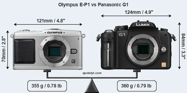 The physical size and weight of the Olympus E-P1 and the Panasonic G1 are illustrated in the side-by-side display below. The two cameras are presented according to their relative size. Three consecutive perspectives from the front, the top, and the back are available. All width, height and depth dimensions are rounded to the nearest millimeter.