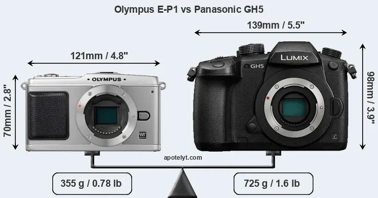 If the front view area (width x height) of the cameras is taken as an aggregate measure of their size, the Panasonic GH5 is considerably larger (61 percent) than the Olympus E-P1. Moreover, the GH5 is substantially heavier (104 percent) than the E-P1. It is noteworthy in this context that the GH5 is splash and dust-proof, while the E-P1 does not feature any corresponding weather-sealing.
