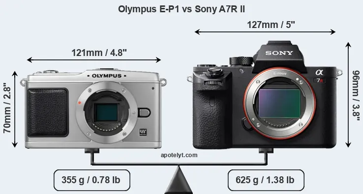If the front view area (width x height) of the cameras is taken as an aggregate measure of their size, the Sony A7R II is considerably larger (44 percent) than the Olympus E-P1. Moreover, the A7R II is substantially heavier (76 percent) than the E-P1. It is noteworthy in this context that the A7R II is splash and dust-proof, while the E-P1 does not feature any corresponding weather-sealing.