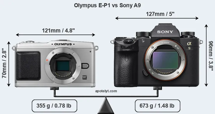 If the front view area (width x height) of the cameras is taken as an aggregate measure of their size, the Sony A9 is considerably larger (44 percent) than the Olympus E-P1. Moreover, the A9 is substantially heavier (90 percent) than the E-P1. It is noteworthy in this context that the A9 is splash and dust-proof, while the E-P1 does not feature any corresponding weather-sealing.