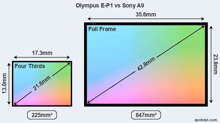 Of the two cameras under consideration, the Olympus E-P1 features a Four Thirds sensor and the Sony A9 a full frame sensor. The sensor area in the A9 is 276 percent bigger. As a result of these sensor size differences, the cameras have a format factor of, respectively, 2.0 and 1.0. The sensor in the E-P1 has a native 4:3 aspect ratio, while the one in the A9 offers a 3:2 aspect.