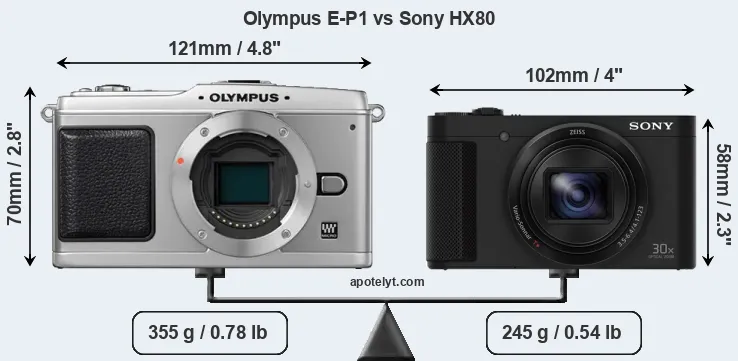 The side-by-side display below illustrates the physical size and weight of the Olympus E-P1 and the Sony HX80. The two cameras are presented according to their relative size. Three successive views from the front, the top, and the rear are shown. All width, height and depth measures are rounded to the nearest millimeter.