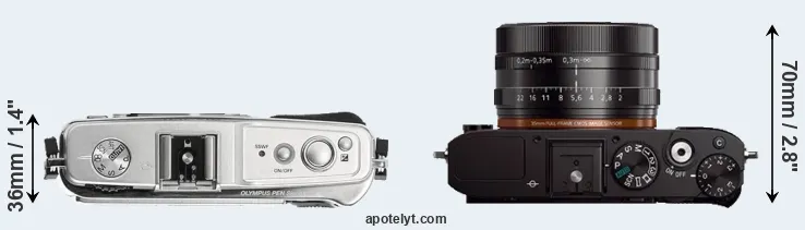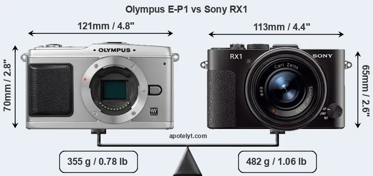 An illustration of the physical size and weight of the Olympus E-P1 and the Sony RX1 is provided in the side-by-side display below. The two cameras are presented according to their relative size. Three successive views from the front, the top, and the rear are shown. All size dimensions are rounded to the nearest millimeter.