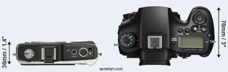 The physical size and weight of the Olympus E-P2 and the Sony A99 II are illustrated in the side-by-side display below. The two cameras are presented according to their relative size. Three consecutive perspectives from the front, the top, and the back are available. All width, height and depth dimensions are rounded to the nearest millimeter.