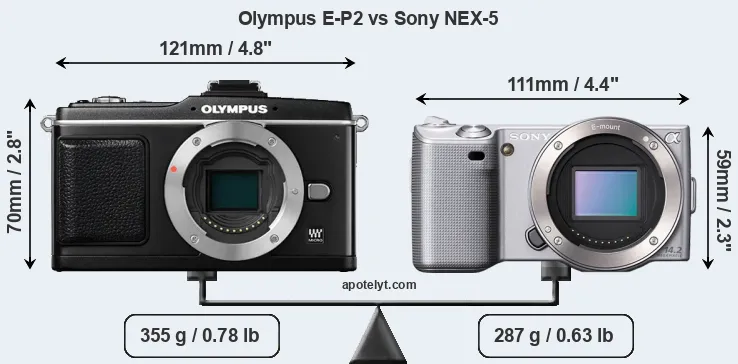 The physical size and weight of the Olympus E-P2 and the Sony NEX-5 are illustrated in the side-by-side display below. The two cameras are presented according to their relative size. Three consecutive perspectives from the front, the top, and the back are available. All width, height and depth measures are rounded to the nearest millimeter.