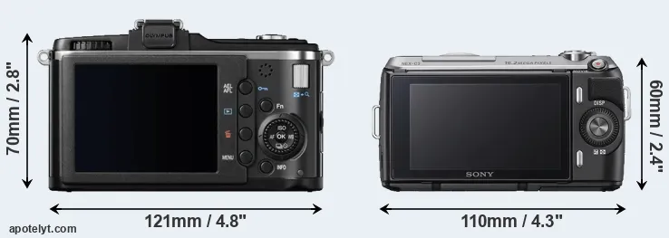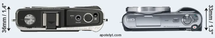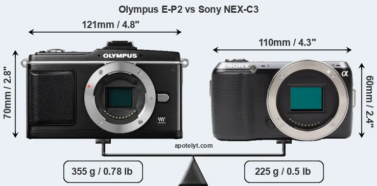 The side-by-side display below illustrates the physical size and weight of the Olympus E-P2 and the Sony NEX-C3. The two cameras are presented according to their relative size. Three consecutive views from the front, the top, and the rear side are shown. All width, height and depth dimensions are rounded to the nearest millimeter.