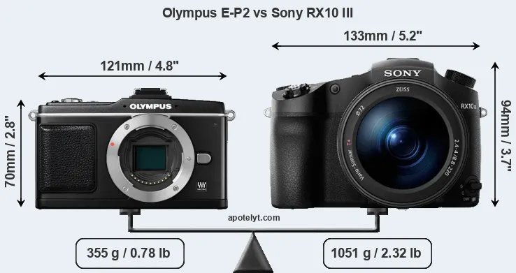 If the front view area (width x height) of the cameras is taken as an aggregate measure of their size, the Sony RX10 III is considerably larger (48 percent) than the Olympus E-P2. It is noteworthy in this context that the RX10 III is splash and dust-proof, while the E-P2 does not feature any corresponding weather-sealing.