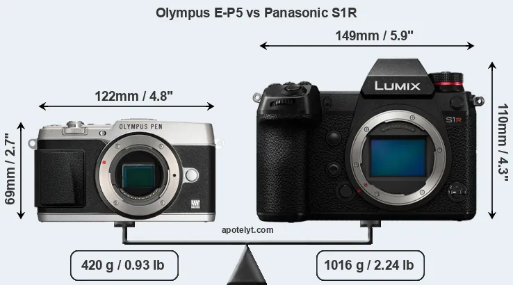 If the front view area (width x height) of the cameras is taken as an aggregate measure of their size, the Panasonic S1R is considerably larger (95 percent) than the Olympus E-P5. Moreover, the S1R is substantially heavier (142 percent) than the E-P5. It is noteworthy in this context that the S1R is splash and dust-proof, while the E-P5 does not feature any corresponding weather-sealing.