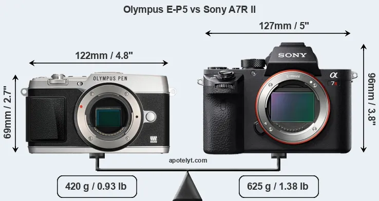 If the front view area (width x height) of the cameras is taken as an aggregate measure of their size, the Sony A7R II is considerably larger (45 percent) than the Olympus E-P5. Moreover, the A7R II is substantially heavier (49 percent) than the E-P5. It is noteworthy in this context that the A7R II is splash and dust-proof, while the E-P5 does not feature any corresponding weather-sealing.