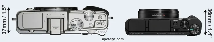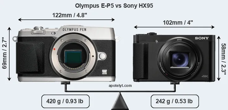 The physical size and weight of the Olympus E-P5 and the Sony HX95 are illustrated in the side-by-side display below. The two cameras are presented according to their relative size. Three successive views from the front, the top, and the rear are shown. All width, height and depth dimensions are rounded to the nearest millimeter.