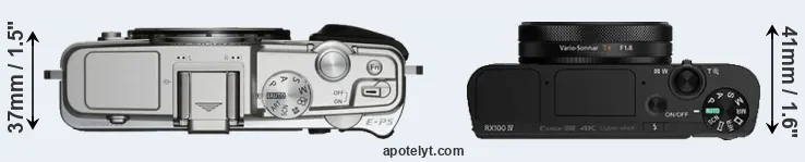 The side-by-side display below illustrates the physical size and weight of the Olympus E-P5 and the Sony RX100 IV. The two cameras are presented according to their relative size. Three consecutive perspectives from the front, the top, and the back are available. All size dimensions are rounded to the nearest millimeter.