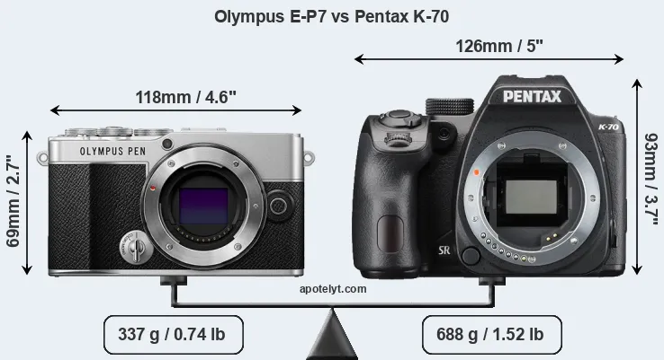 If the front view area (width x height) of the cameras is taken as an aggregate measure of their size, the Pentax K-70 is considerably larger (44 percent) than the Olympus E-P7. Moreover, the K-70 is substantially heavier (104 percent) than the E-P7. It is noteworthy in this context that the K-70 is splash and dust-proof, while the E-P7 does not feature any corresponding weather-sealing.