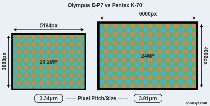With 24MP, the K-70 offers a higher resolution than the E-P7 (20.2MP), but the K-70 nevertheless has larger individual pixels (pixel pitch of 3.91μm versus 3.34μm for the E-P7) due to its larger sensor. However, the E-P7 is a much more recent model (by 5 years) than the K-70, and its sensor will have benefitted from technological advances during this time that enhance the light gathering capacity of its pixel-units. Coming back to sensor resolution, it should be mentioned that the K-70 has no anti-alias filter installed, so that it can capture all the detail its sensor resolves.
