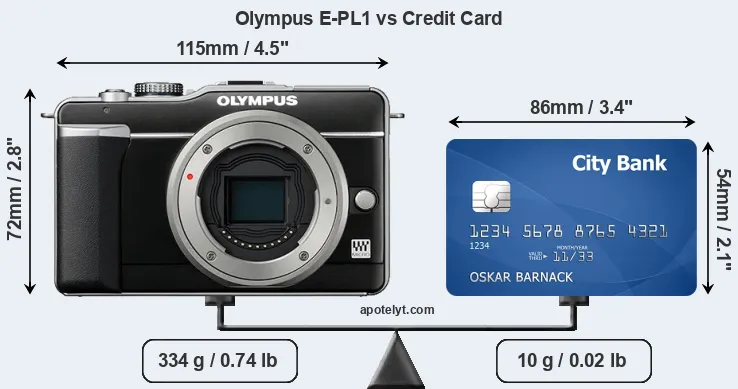 An illustration of the physical dimensions of the Olympus E-PL1 vis-à-vis a credit card is provided in the side-by-side display below. Three consecutive perspectives from the front, the top, and the back are presented. All width, height and depth dimensions are rounded to the nearest millimeter.