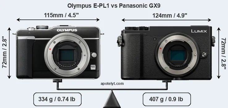 An illustration of the physical size and weight of the Olympus E-PL1 and the Panasonic GX9 is provided in the side-by-side display below. The two cameras are presented according to their relative size. Three consecutive perspectives from the front, the top, and the back are available. All width, height and depth dimensions are rounded to the nearest millimeter.