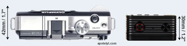 An illustration of the physical size and weight of the Olympus E-PL1 and the Sony RX0 is provided in the side-by-side display below. The two cameras are presented according to their relative size. Three successive views from the front, the top, and the rear are shown. All width, height and depth dimensions are rounded to the nearest millimeter.