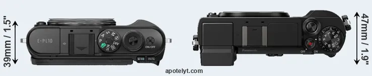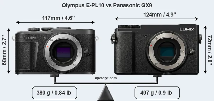 The side-by-side display below illustrates the physical size and weight of the Olympus E-PL10 and the Panasonic GX9. The two cameras are presented according to their relative size. Three consecutive views from the front, the top, and the rear side are shown. All width, height and depth measures are rounded to the nearest millimeter.
