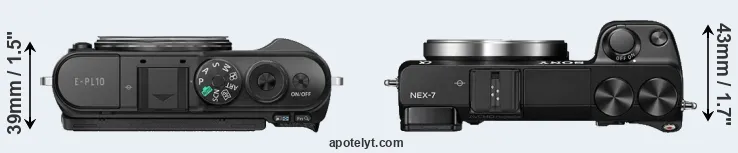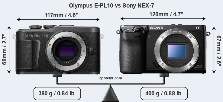 An illustration of the physical size and weight of the Olympus E-PL10 and the Sony NEX-7 is provided in the side-by-side display below. The two cameras are presented according to their relative size. Three consecutive perspectives from the front, the top, and the back are available. All width, height and depth measures are rounded to the nearest millimeter.