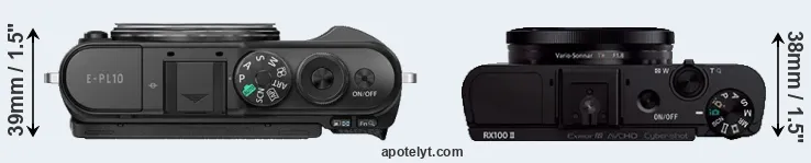 The physical size and weight of the Olympus E-PL10 and the Sony RX100 II are illustrated in the side-by-side display below. The two cameras are presented according to their relative size. Three consecutive views from the front, the top, and the rear side are shown. All width, height and depth measures are rounded to the nearest millimeter.
