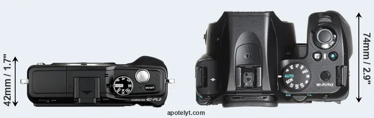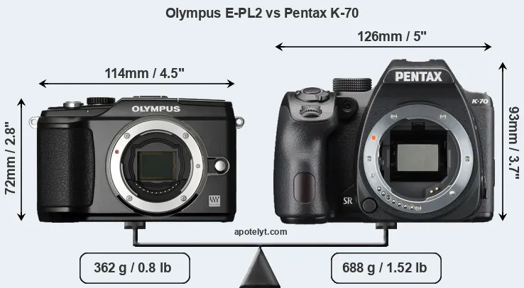 An illustration of the physical size and weight of the Olympus E-PL2 and the Pentax K-70 is provided in the side-by-side display below. The two cameras are presented according to their relative size. Three consecutive perspectives from the front, the top, and the back are available. All width, height and depth measures are rounded to the nearest millimeter.