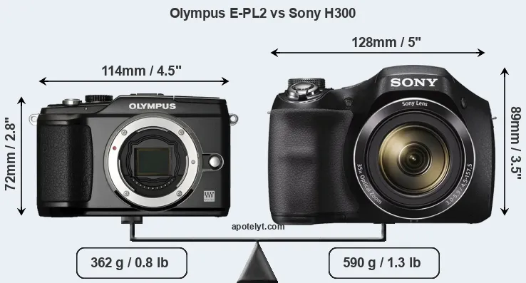 The physical size and weight of the Olympus E-PL2 and the Sony H300 are illustrated in the side-by-side display below. The two cameras are presented according to their relative size. Three consecutive perspectives from the front, the top, and the back are available. All width, height and depth dimensions are rounded to the nearest millimeter.